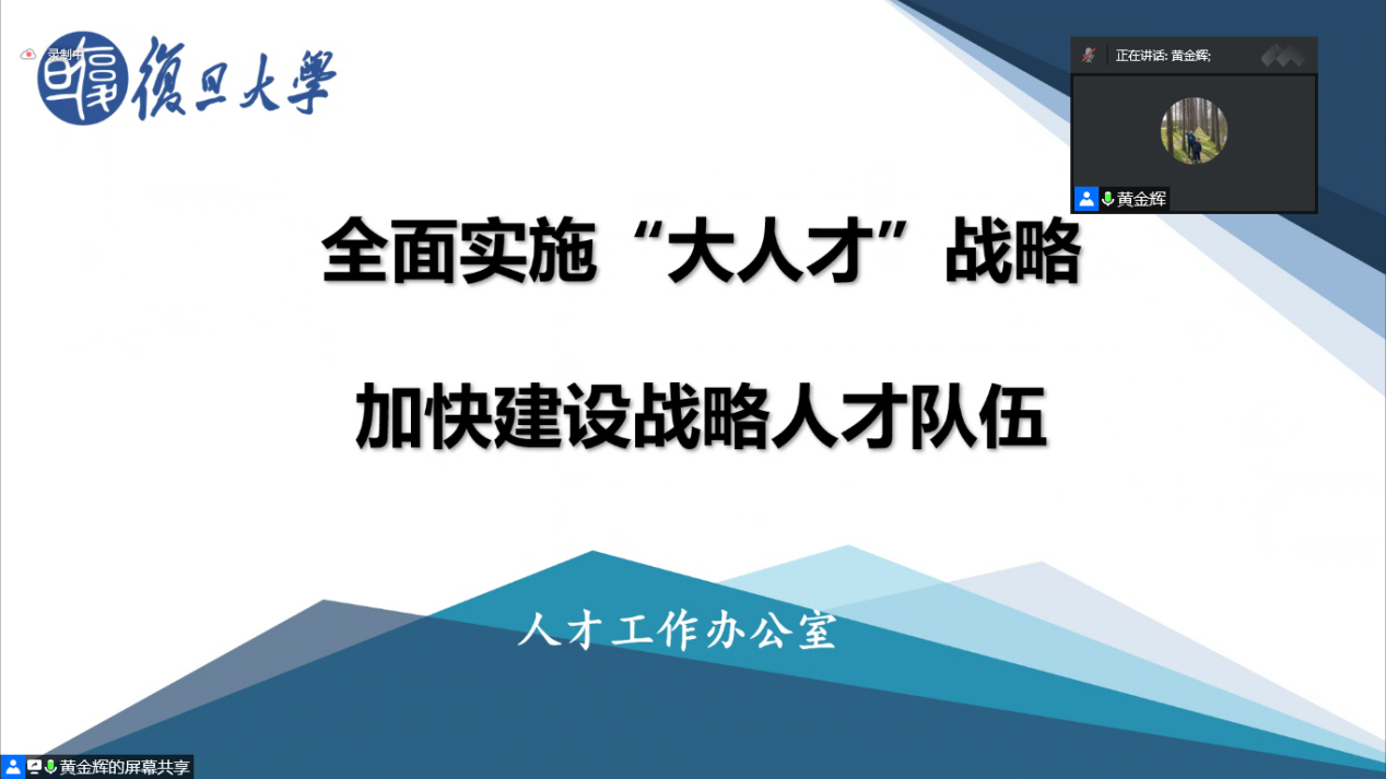 校人才工作办公室主任黄金辉以“全面实施‘大人才’战略 加快建设战略人才队伍”为题,汇报了经2022年1月学校人才工作会议研究确立的学校“大人才”战略核心内涵、以及学校“十四五”人才工作的主要任务。他表示,“大人才”战略的核心内涵在于树立大目标、塑造大格局、形成大思路,为此学校在“十四五”期间将进一步完善人才规划,强化规划战略引领作用;坚持引育并举,加快建设战略人才队伍;突破制度瓶颈,深化人才体制机制改革;加强党的领导,发挥党管人才制度优势,齐心协力,为国家建设人才高地、为第一个复旦建设提供坚实的人才支撑。