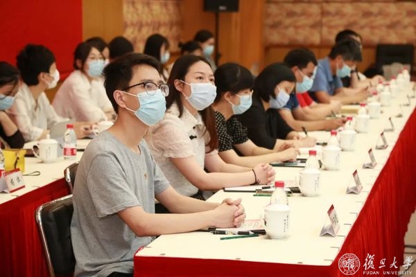 校党委书记焦扬出席并讲话,校党委常务副书记裘新、周亚明,校党委副书记尹冬梅,上海医学院党委副书记、副院长徐军,复旦大学退休教授、陈望道之子陈振新及夫人朱良玉,上海电影集团副总裁、电影《望道》监制徐春萍,解放日报特聘首席记者、《当好改革开放的排头兵——习近平上海足迹》主要参与人高渊,武警上海总队执勤第四支队十中队战士、兵哥说党史讲解员徐子建,浙江义乌市委常委、宣传部部长朱有清,浙江义乌陈望道故居讲解团团长刘亚琴,复旦大学“星火”党员志愿服务队代表,“小火苗”代表,校党委部门、望道研究院负责人,陈振新、朱良玉所在支部的支部书记,在校师生代表,学校各分党委班子成员,支部书记代表,辅导员代表,马克思主义学院望道班同学,五四青年奖章获得者,义乌市委有关部门负责人,望道宣讲团志愿者等以线上线下相结合的形式出席座谈会。会议由尹冬梅主持。