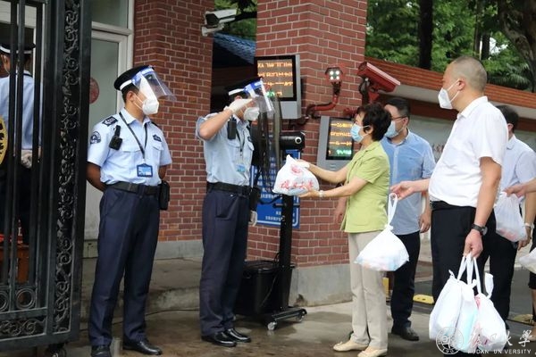 “没有大家的守护,就没有我们的平安校园,你们是守护校园安全的‘无名英雄’,同志们辛苦了!”邯郸校区正门前,焦扬一行看望烈日下坚守岗位的校园安保队伍,询问他们日常工作及生活情况,称赞队员们在疫情期间为守护校园安全做出的贡献。得知队员们每天在烈日下工作数小时,焦扬关照保卫部门合理安排值守,叮嘱大家在严守校门的同时,注意做好防暑降温。暑假期间,各校区数百名安保队员不舍昼夜、奋战一线,对进出校园的来访人员、车辆,始终坚持严格把关,并做好校园内部及周边的日常巡视,牢牢守住校园安全“第一道防线”。
