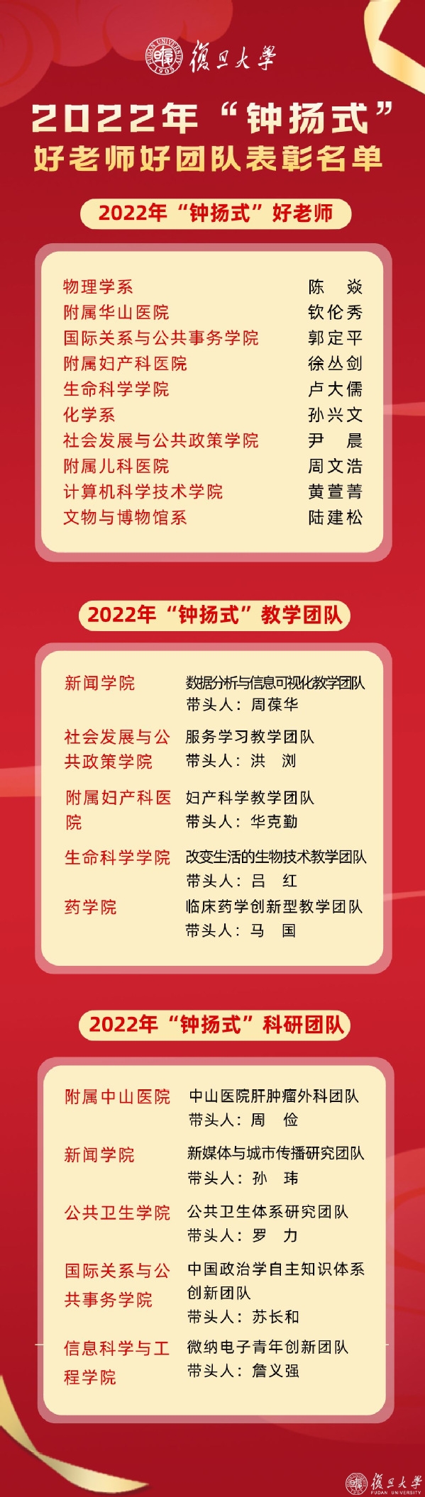 昨天,总书记以给北京师范大学“优师计划”师范生回信的方式,对教师队伍再次提出成为党和人民满意的“四有”好老师的期望和要求。过去一年来,在学校党委领导下,全校广大教职工深入学习贯彻习近平新时代中国特色社会主义思想,坚定心中所信、矢志拼搏奋斗,团结一心落实立德树人根本任务,守牢校园疫情防线,推动“双一流”建设提质增效,全面推进“第一个复旦”建设,展现了踔厉奋发的昂扬斗志和精神风貌。这一年,复旦教师坚持立德树人,用言传身教铸魂育人,吴晓明教授荣获全国高校教师杰出教学奖,葛均波院士领衔的“中山医院心内科教师团队”入选第二批“全国高校黄大年式教师团队”,陈思和教授荣获“全国教材建设先进个人”……一系列荣誉背后,离不开复旦教师几十年如一日的坚守与付出。这一年,复旦教师团结一心共抗疫情,用坚守诠释责任担当,勇攀科技高峰,用创新创造服务国家社会,扎根中国大地,用实际行动书写山海深情。